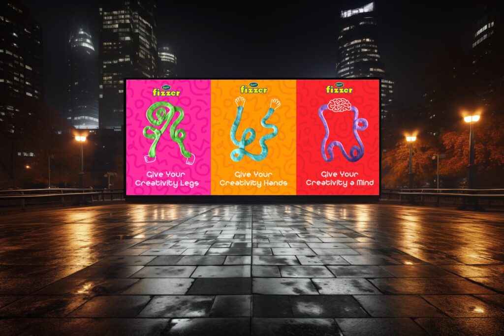 This campaign encouraged kids to shape their Fizzers into creative forms, using the candy’s ability to bend with temperature. The result was a bold, hands-on campaign that turned Fizzer into a tool for imagination, with stretchy visuals and interactive packaging that invited kids to unleash their creative fizzion.