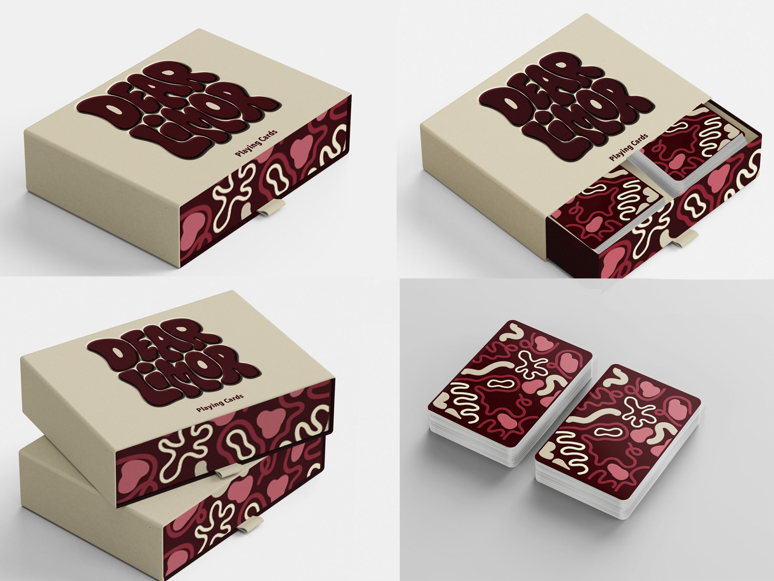 “Dear Limor” is a custom-designed card deck that visually unpacks my identity as a designer. The drawer-style box features bold, bubbly typography and an expressive illustrated pattern - a mix of thick, flowing shapes pulled directly from the traits I value most: boldness, playfulness, intention, and versatility.